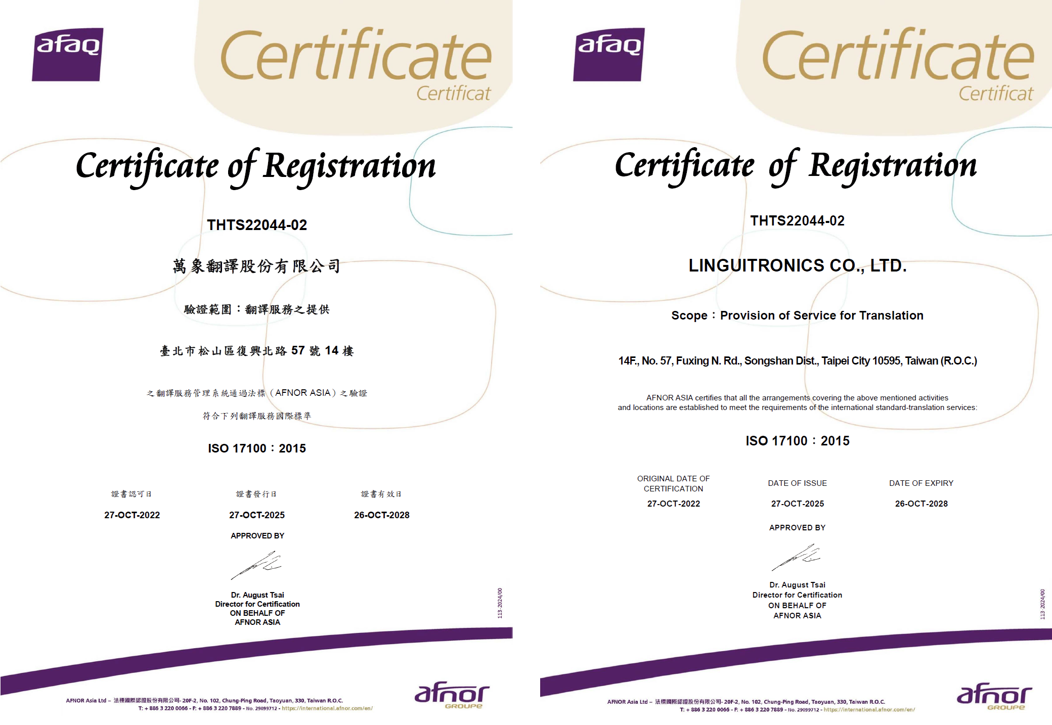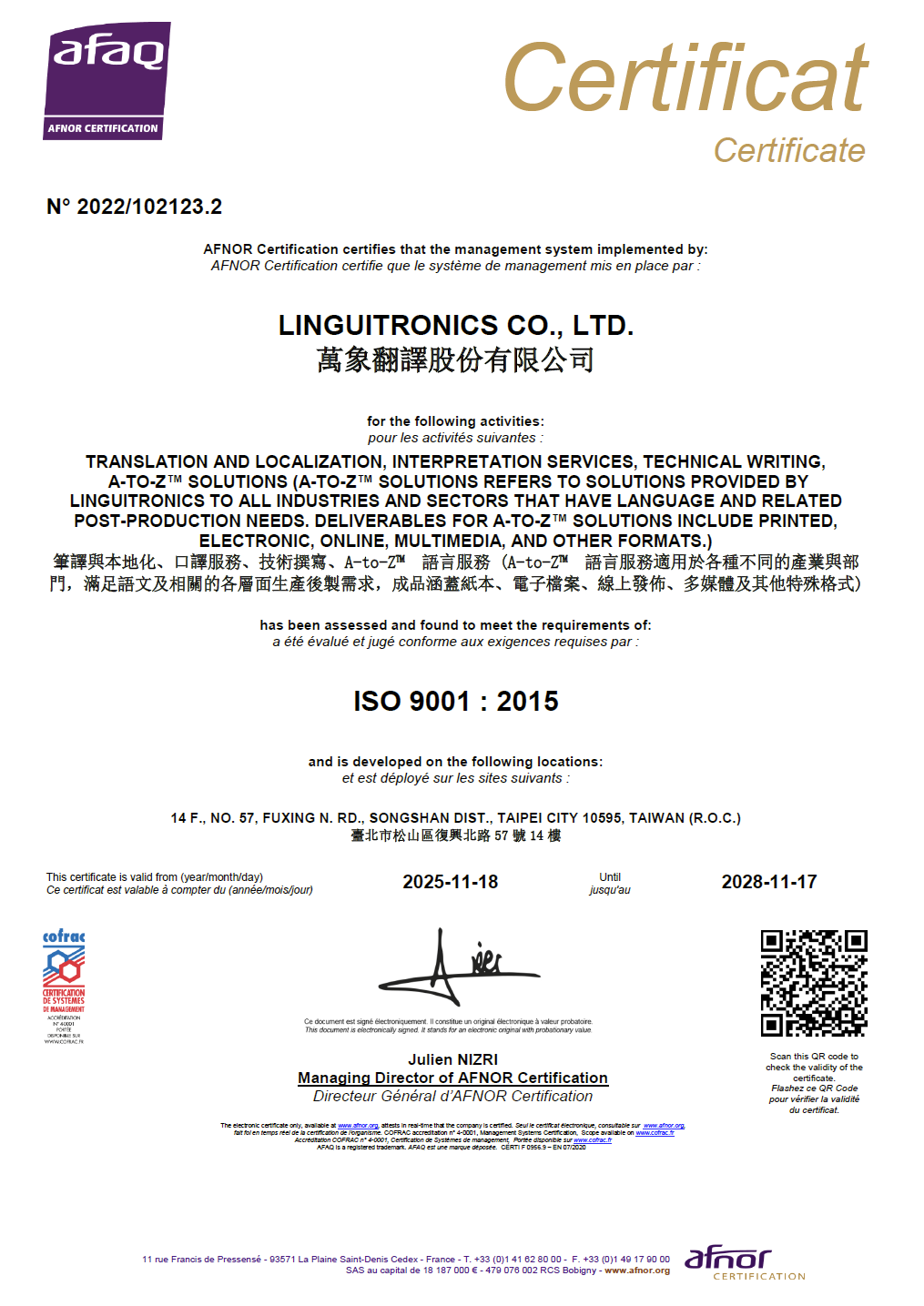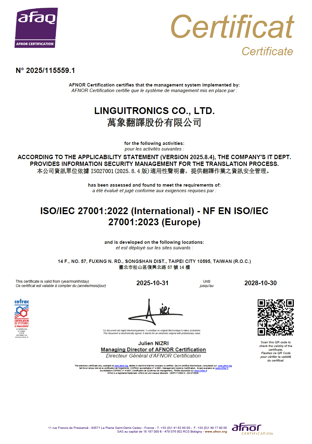 Linguitronics is recognized for its professional services and is a member of the Globalization and Localization Association (GALA), the American Translators Association (ATA), the Japan Translation Association (JTA), the Japan Translation Federation (JTF), the Translation & Attestation Association of Taipei (TAAT), the Translation Association of China (TAC), and other language service industry organizations. For years, Linguitronics has consistently ranked as one of the top 100 language service providers in the world by industry research firms such as CSA Research and Slator. Linguitronics’s standard quality control processes and technology-based operations are ISO 9001:2015, ISO 17100:2015, and ISO 27001 certified and trusted by our clients.